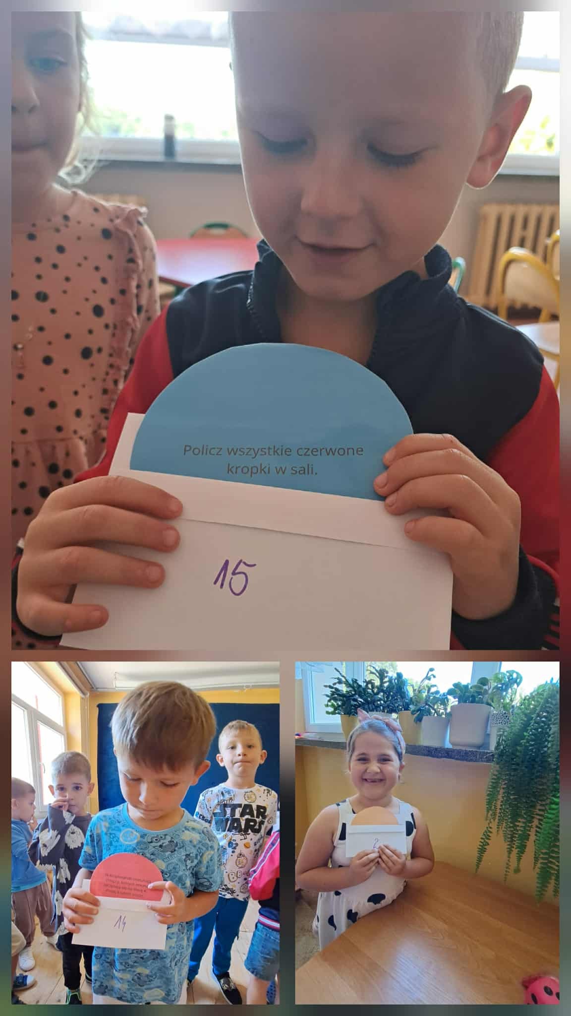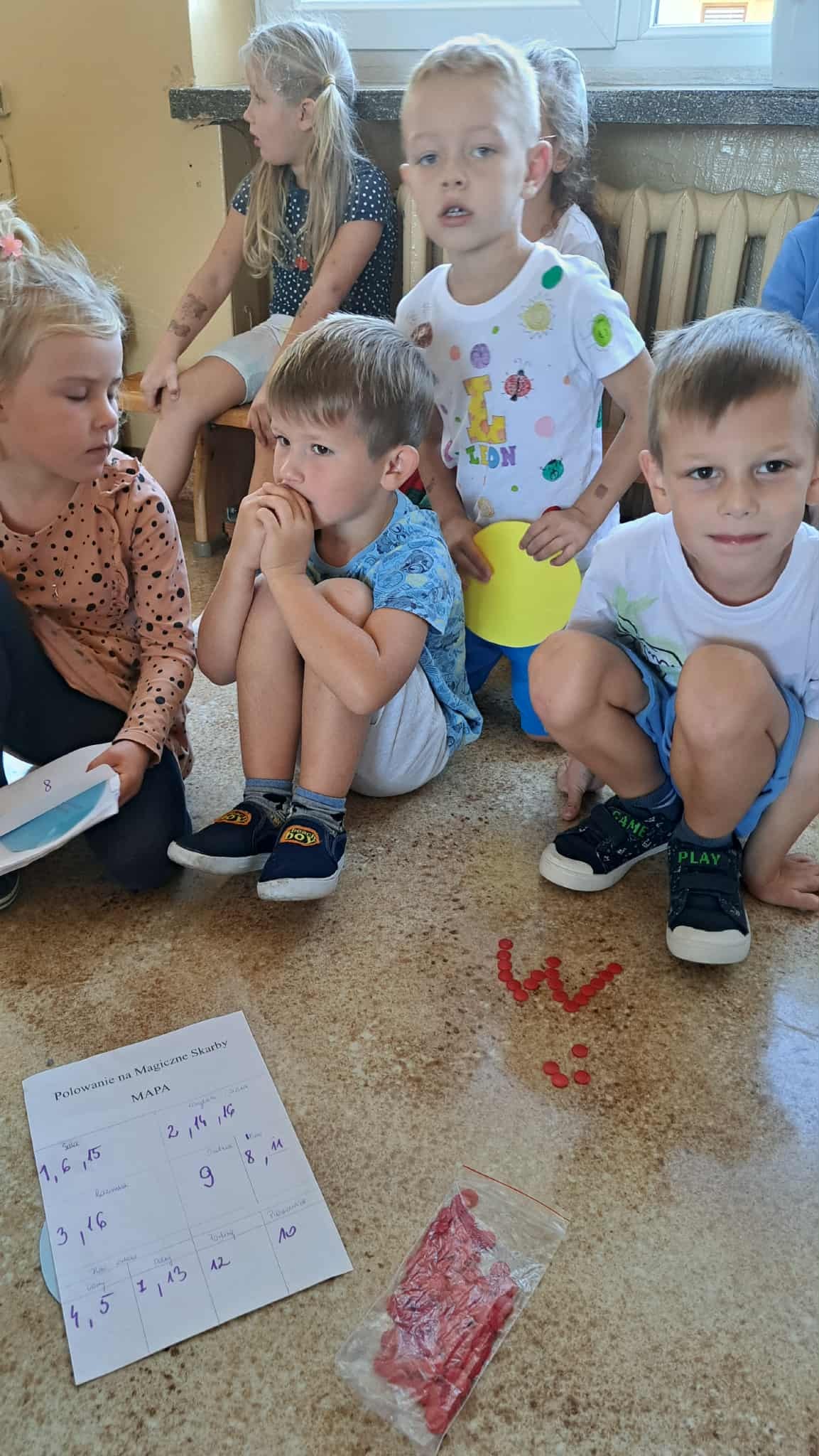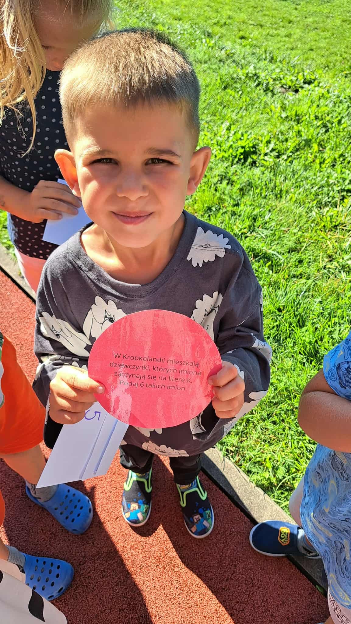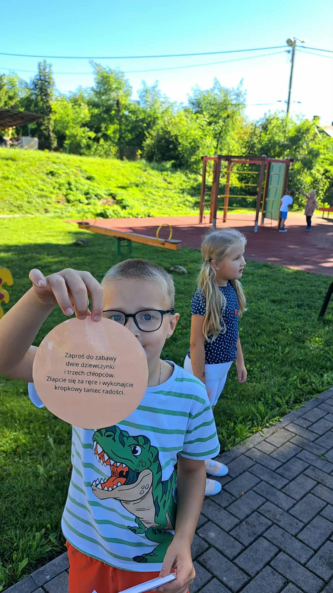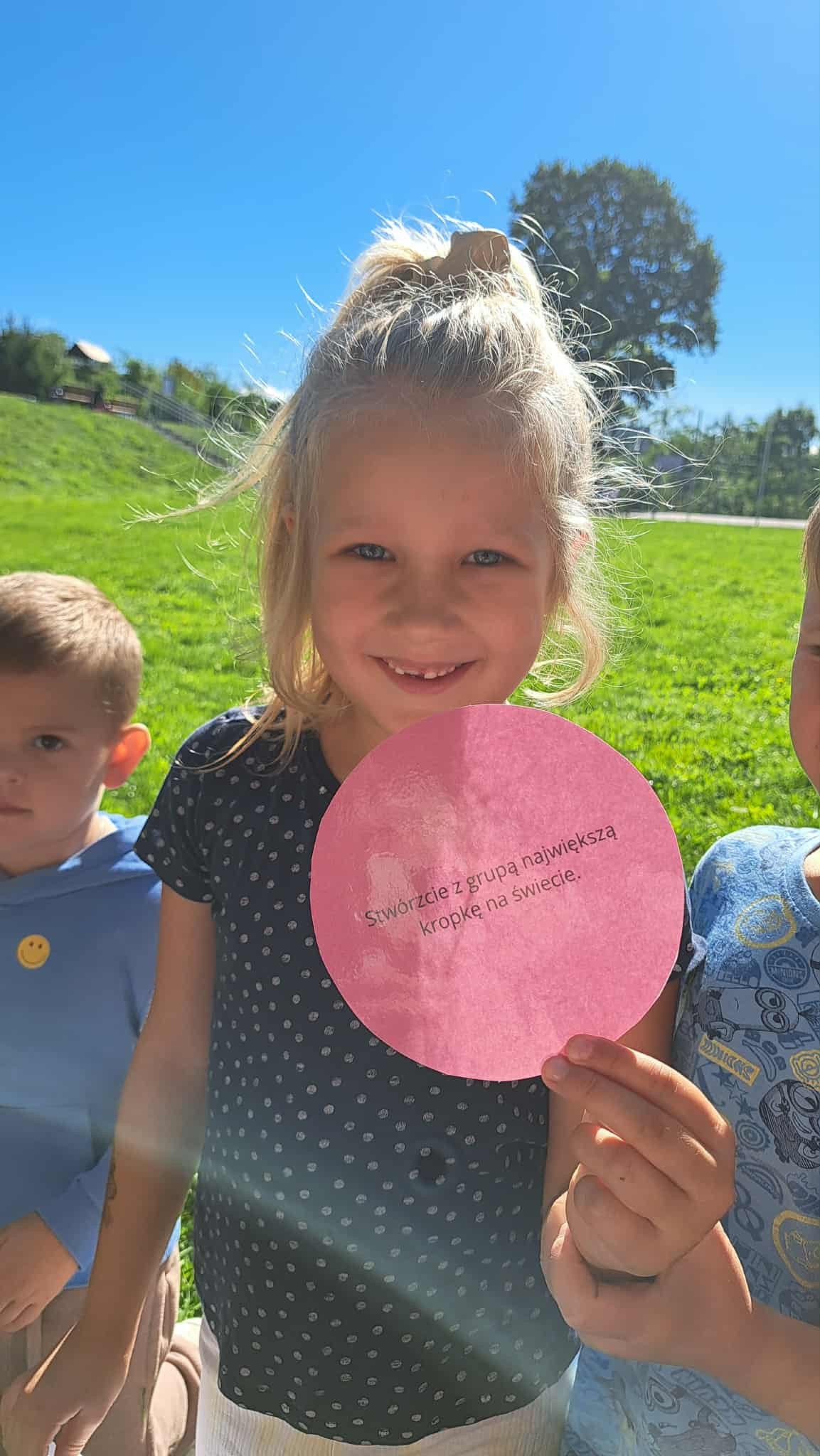 Wyruszyliśmy w grę terenową, w której dzieci szukały ukrytych kropek i wykonywały zadania.