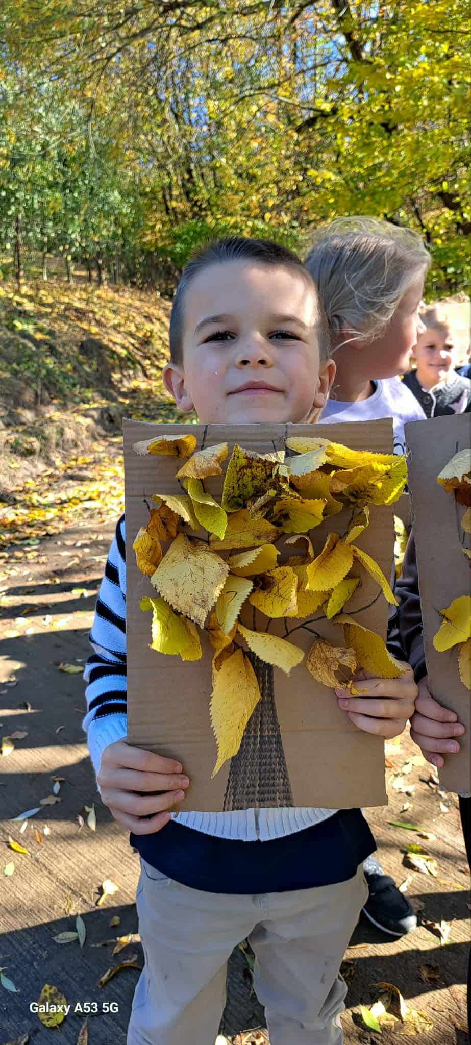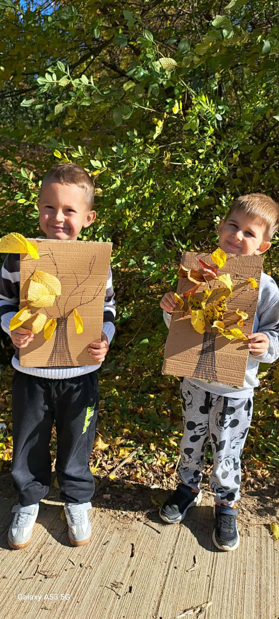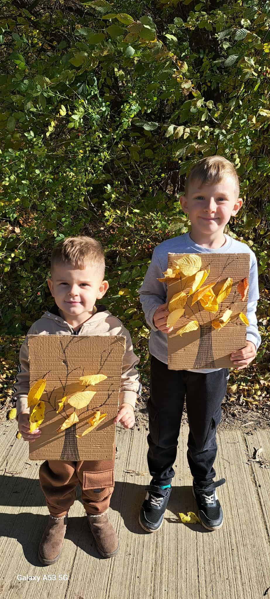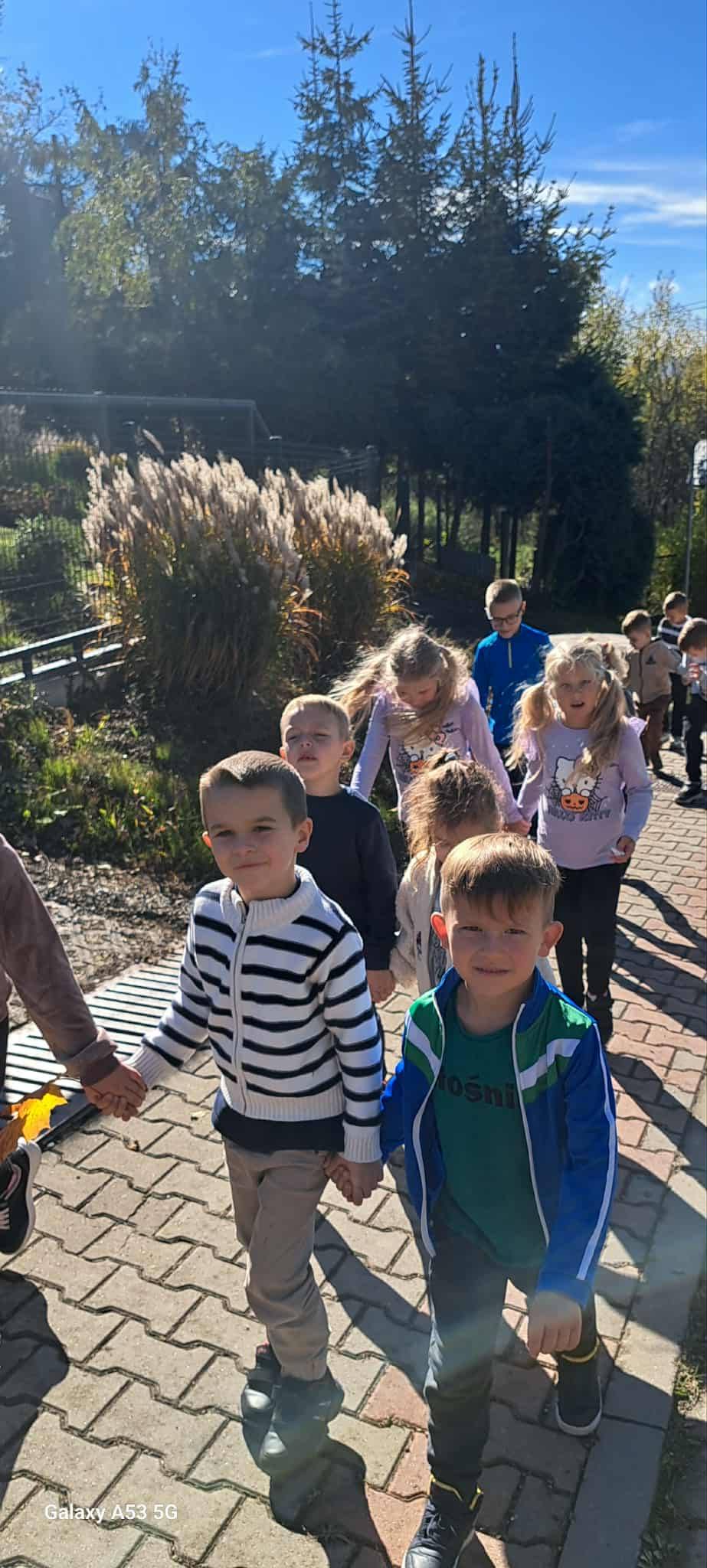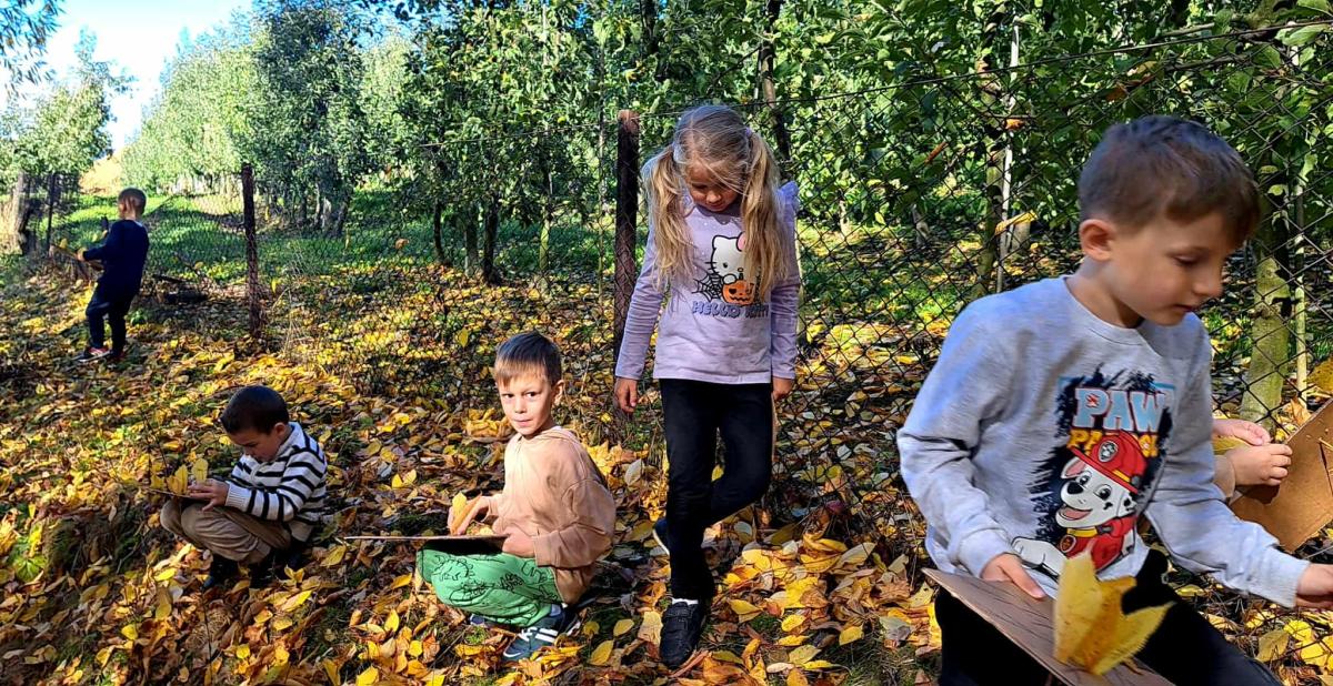 Podczas zajęć w terenie przedszkolaki wzięły udział w wyjątkowej pracy plastycznej pt. „Nasze drzewo z liści”. W otoczeniu przyrody dzieci obserwowały jesienne kolory, zbierały liście i tworzyły z nich wspólne dzieło.