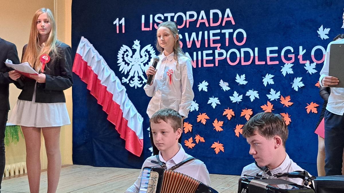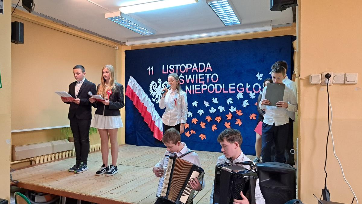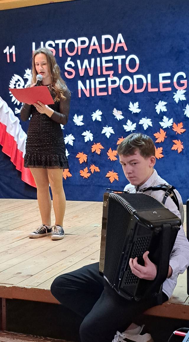 Uczniowie klasy VII w piękny sposób przybliżyli nam najważniejsze wydarzenia historyczne, a także wykonali pieśni patriotyczne i zagrali na akordeonach , tworząc niezwykły, podniosły nastrój.