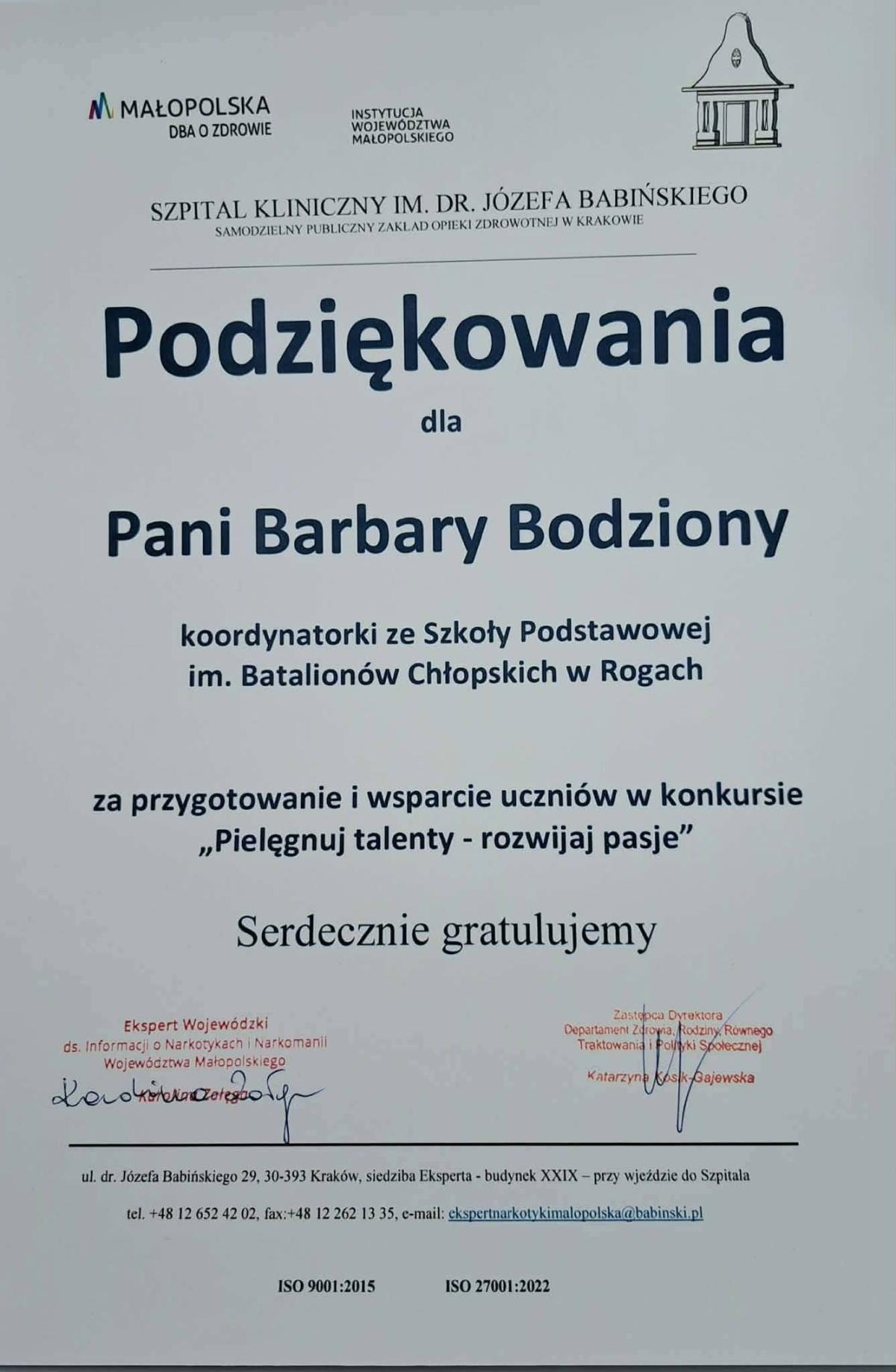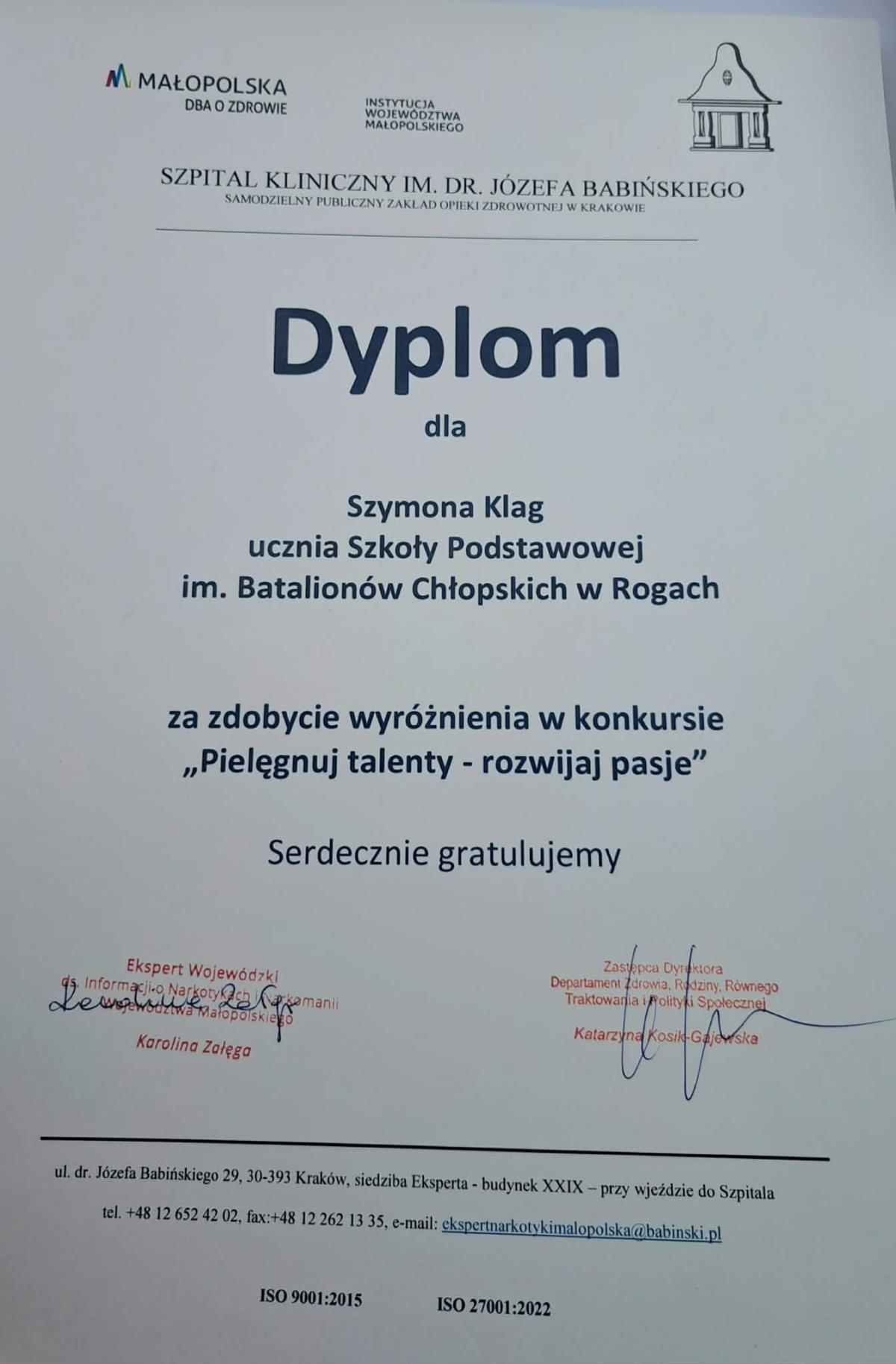Szymon Klag otrzymał wyróżnienie w konkursie „Pielęgnuj talenty – rozwijaj pasje”, organizowanym przez Eksperta Wojewódzkiego ds. Informacji o Narkotykach i Narkomanii.