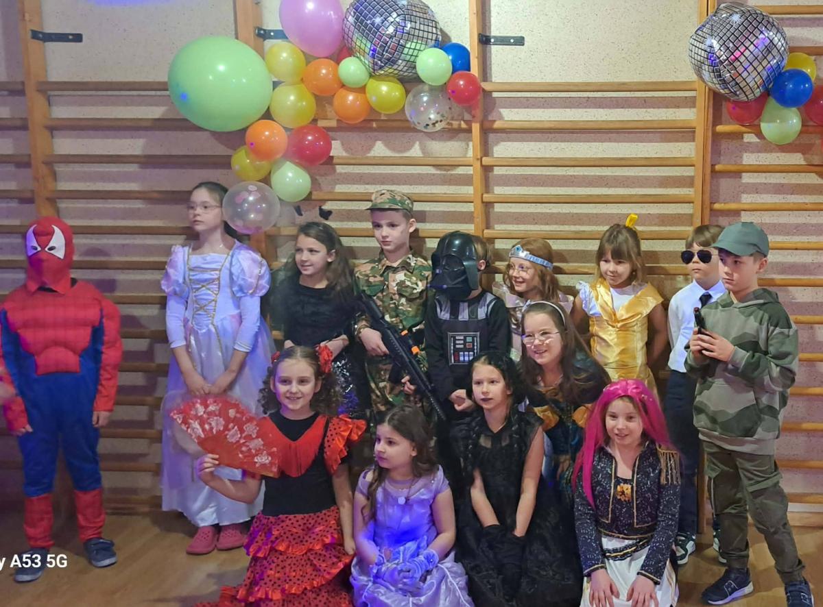 Zabawa karnawałowa uczniów 4-8 pełna radości i dobrej energii. Uczniowie bawili się przy muzyce, którą wcześniej sami wybrali i przekazali przewodniczącemu szkoły, dzięki czemu każdy mógł usłyszeć swoje ulubione utwory. O pyszny poczęstunek zadbała Rada Rodziców, przygotowując hot-dogi, a także nie zabrakło pizzy i różnorodnych przekąsek. Wspólna zabawa, tańce i miła atmosfera sprawiły, że karnawałowe spotkanie na długo pozostanie w pamięci uczestników.