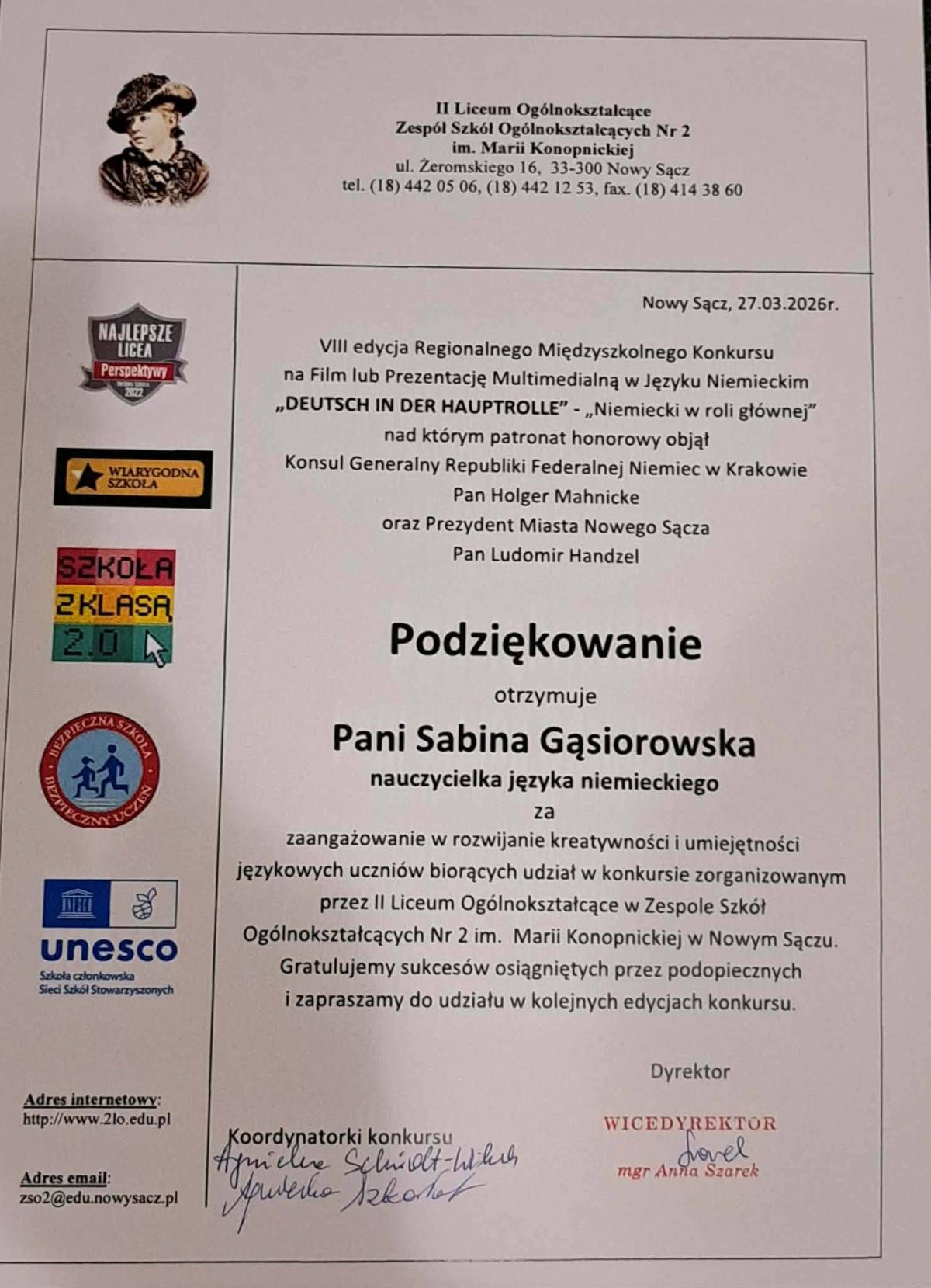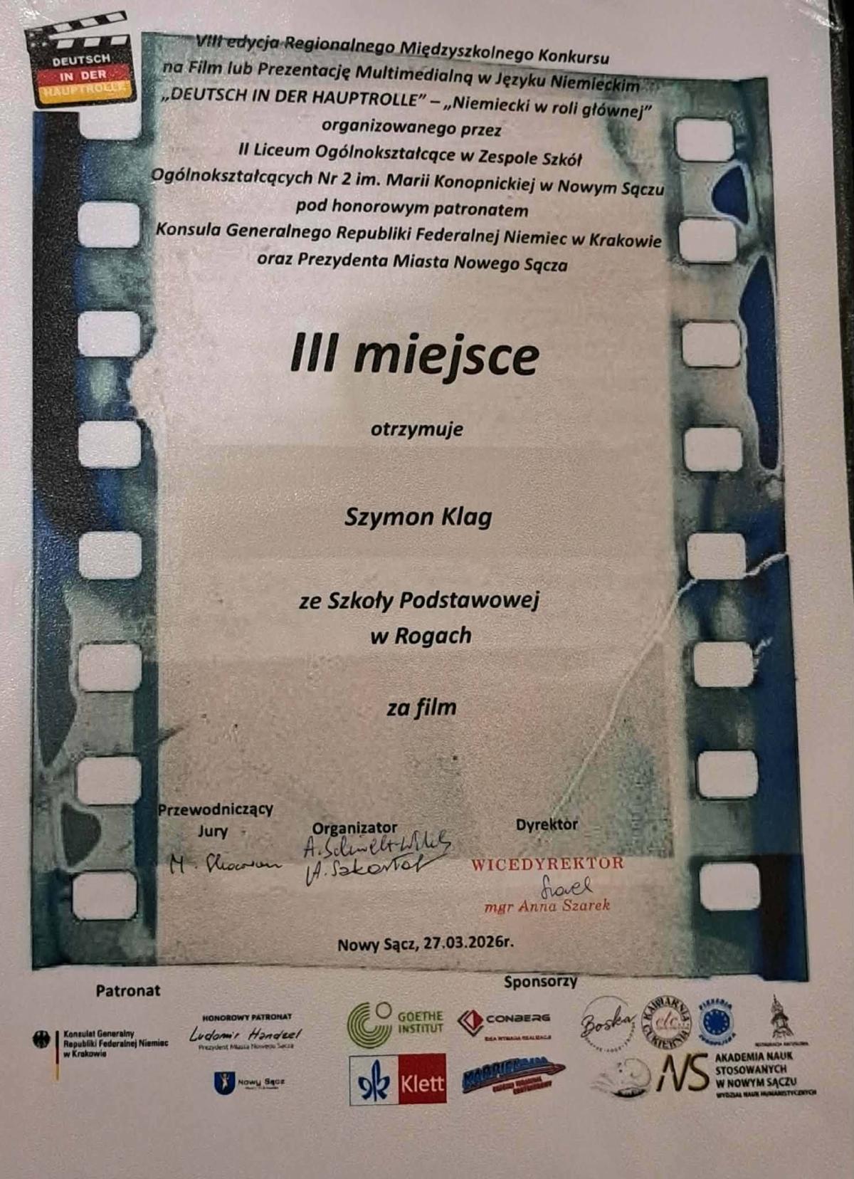 Szymon Klag zajął 3 miejsce w VIII edycji Regionalnego Międzyszkolnego Konkursu na Film lub Prezentację Multimedialną w języku niemieckim „Deutsch in der Hauptrolle” – „Niemiecki w roli głównej”, organizowanego przez II Liceum Ogólnokształcące im. Marii Konopnickiej w Nowym Sączu.